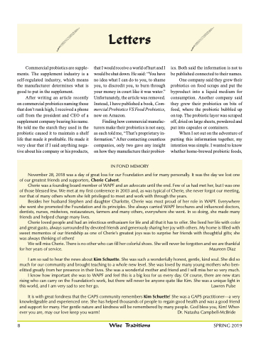 that I would receive a world of hurt and I would be shut down. He said: “You have no idea what I can do to you, to shame you, to discredit you, to burn through your money in court like it was water.” Unfortunately, the article was removed. Instead, I have published a book, Com- mercial Probiotics VS Food Probiotics, now on Amazon.