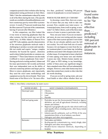 companies posted to their websites after having independent testing performed on their filters. Table 1 lists the contaminants reduced by some or all of the filters during the tests. (The specific results are available at thesafehealthyhome.com/ best-countertop-gravity-water-filter-systems- review/. A result of 75 percent would mean that the filter removed 75 percent of the contaminant, leaving 25 percent after filtration.)