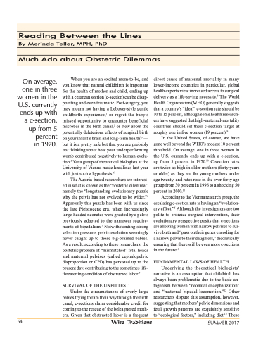 According to the Vienna research group, the escalating c-section rate is having an “evolution- ary effect.”5 Although the investigators are too polite to criticize surgical intervention, their evolutionary perspective posits that c-sections are allowing women with narrow pelvises to sur- vive birth and “pass on their genes encoding for a narrow pelvis to their daughters,” theoretically ensuring that there will be even more c-sections in the future.5